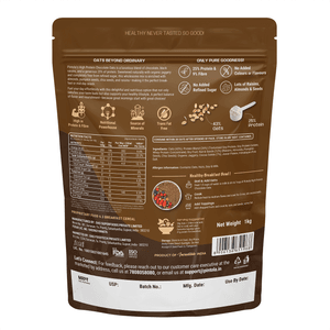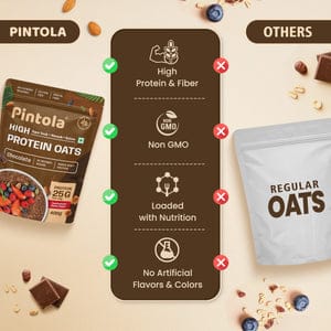 Pintola High Protein Dark Chocolate Oats are a delicious and nutritious breakfast option made with premium whole oats and rich dark chocolate flavor. Packed with protein and dietary fiber, these oats help support muscle recovery, sustained energy, and overall health, making them ideal for fitness-focused and health-conscious individuals.